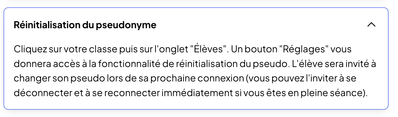 J’ai juste une question, est il possible de changer un pseudo trop explicite, comme momo pour Mohamed et les chiffres de notre département ou même les codes postaux? L’année dernière j’avais même une élève qui avait pris en pseudo son nom de famille en verlan, ce qui en terme d’anonymat n’est pas possible. Les élèves ne devaient-ils pas demander si leur pseudo convenait à l’adulte?