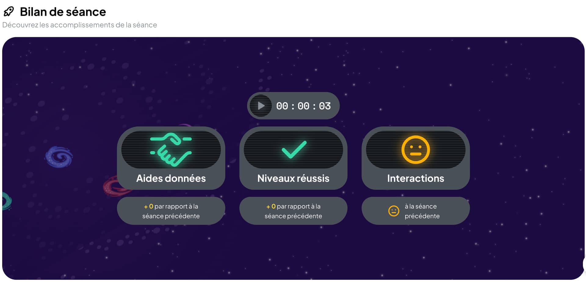 Lorsque vous cliquez sur « Lancer le bilan de la séance », cela génère également le rapport de mission aux élèves (= un bilan de leur accomplissements). Peut-être l’occasion de leur donner la parole pour s’exprimer sur ce qu’ils ont pu réaliser pendant la séance ou ce qu’il ont appris par exemple ?