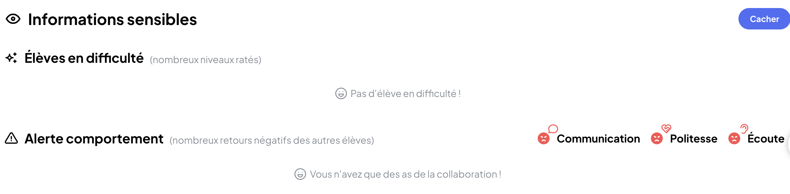 Petite explication de l’indicateur « Interactions » : après chaque interactions, les élèves notent la qualité de la collaboration avec un emoji (sur différentes thématiques). Sur votre bilan, il s’agit de la moyenne de la classe lors de la séance. Si l’emoji est orange ou rouge, nous vous conseillons de prendre connaissance des élèves concernés dans la partie « alerte comportement » juste en dessous.